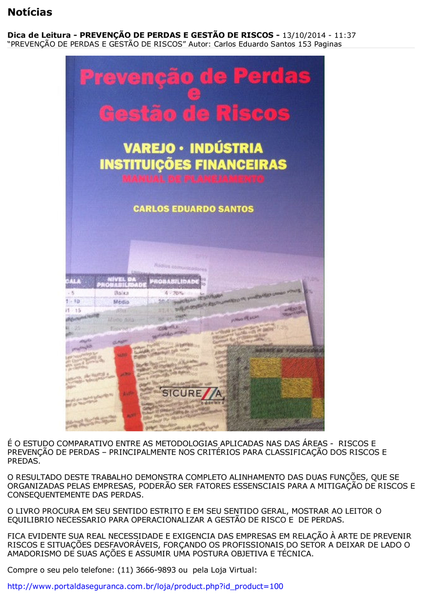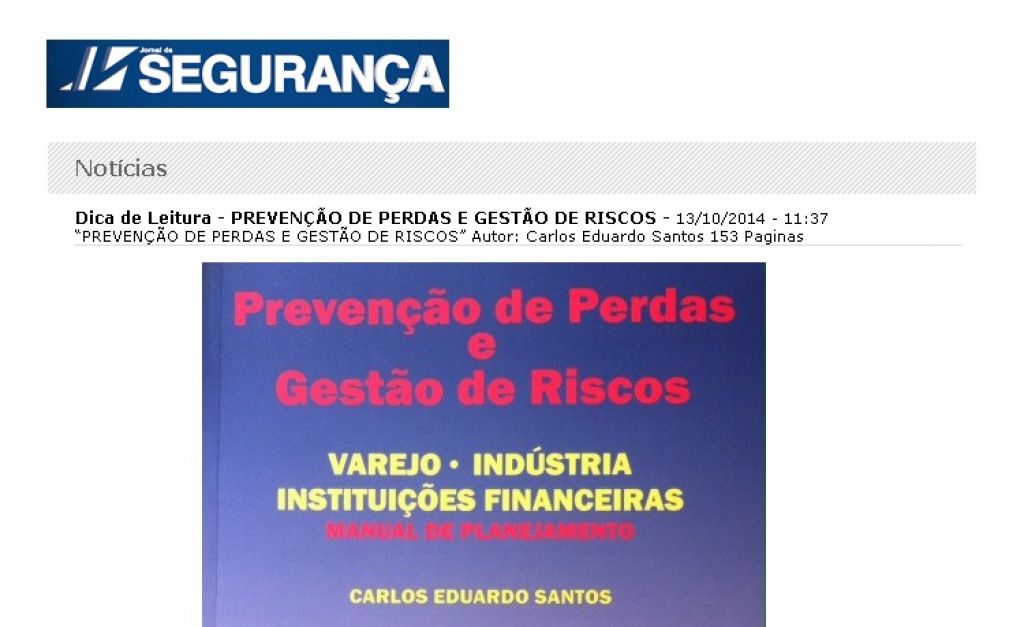 O Jornal da Segurança – mídia composta por profissionais do setor – indicou esta semana o livro “PREVENÇÃO DE PERDAS E GESTÃO DE RISCOS” do professor Carlos Eduardo Santos para leitura.