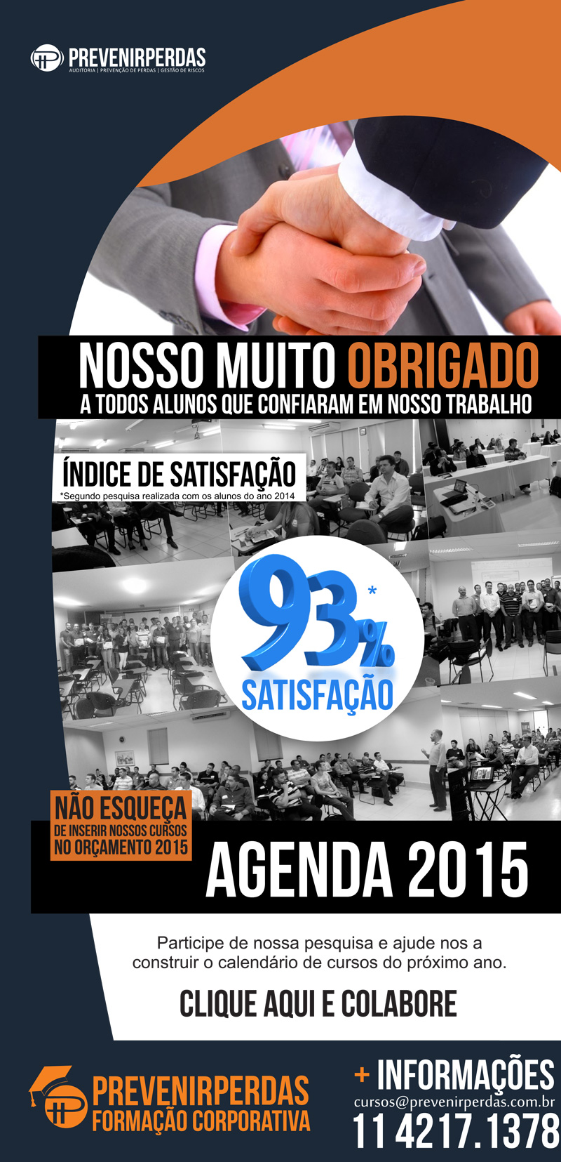 A pesquisa, que foi feita com todos os participantes do curso no ano, indicou que 93% dos alunos ficaram plenamente satisfeitos com o conteúdo proposto. E como a palavra de ordem no Prevenir Perdas é interação, mais uma vez a direção do curso pede a ajuda dos membros para construir o calendário de cursos para 2015. Clicando aqui você assinala os temas de cursos de seu interesse.