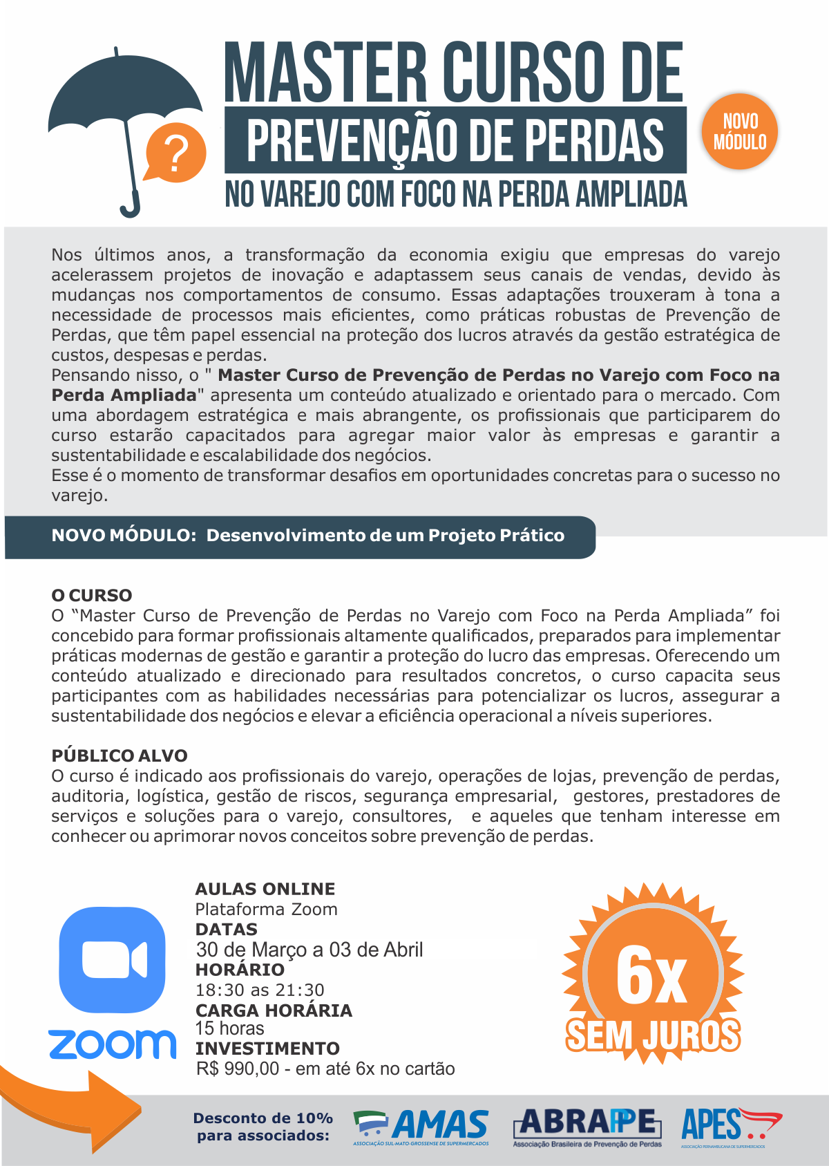 - Investimento: R$ 990,00 (Pagamento no cartão em até 6 vezes) - 10% de desconto associados AMAS - ABRAPPE - APES